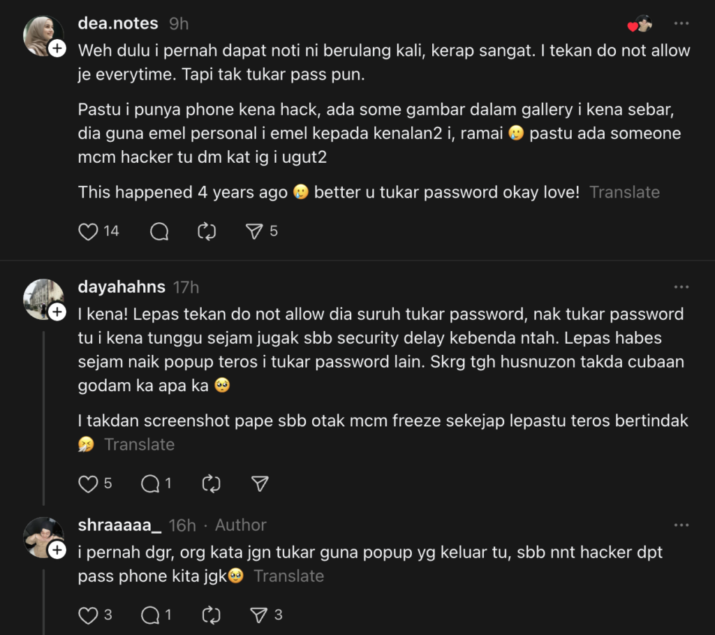 "Weh guys, aku tiba-tiba dapat notification ni. Tolongggg, benda ni betul ke? Lepas aku tekan do not allow tu, dia suruh tukar password, tapi aku tekan later," katanya.