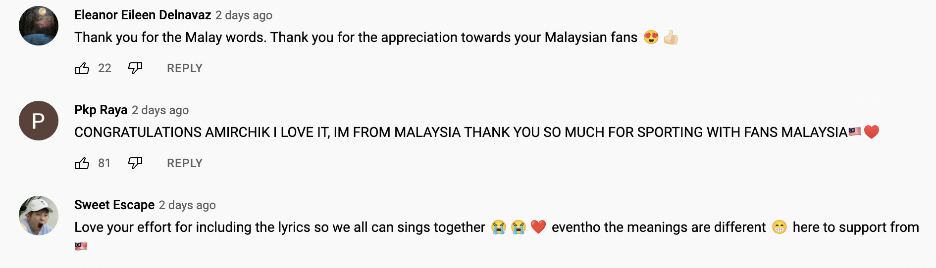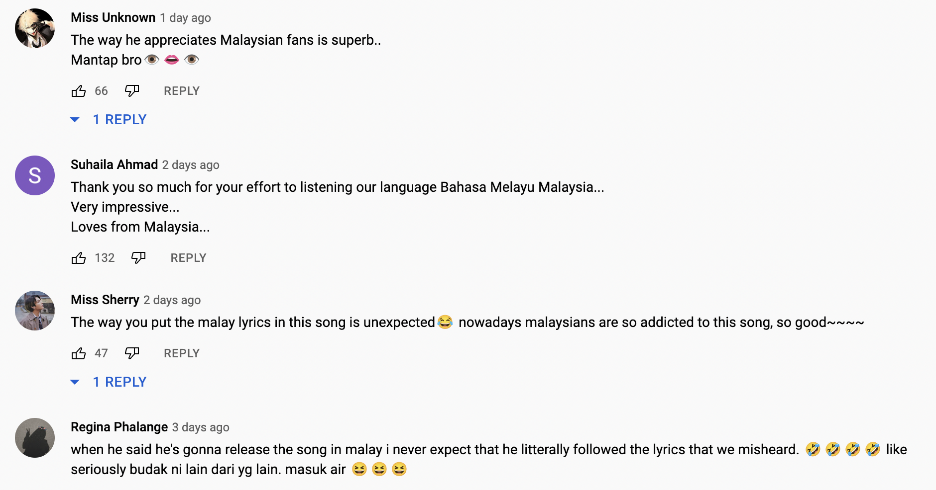 Dalam pada itu, tinjauan di ruangan komen mendapati rata-rata netizen Malaysia memberikan pujian buatnya kerana menghargai peminatnya di Malaysia.