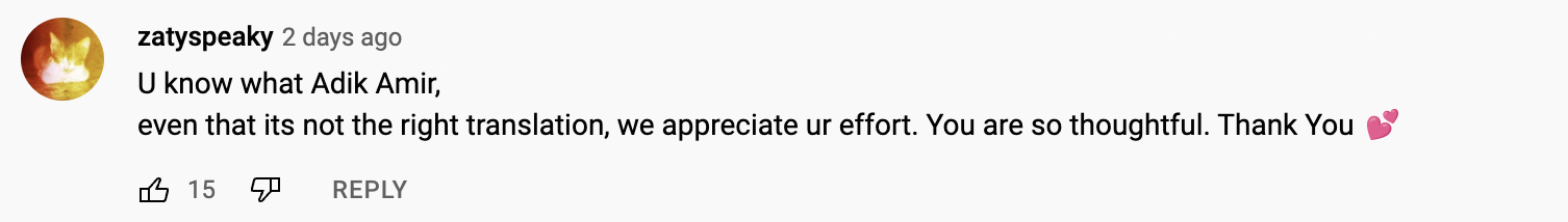 Walaupun ia bukanlah bahasa Melayu yang betul, tetapi effortnya untuk meletakkan lirik yang seakan dengan bunyinya itu ternyata mendapat pujian netizen walaupun ia sangat kelakar.