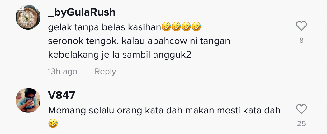 Sementara itu, tinjauan di ruangan komen mendapati rata-rata netizen turut terhibur melihatnya dan memberikan pelbagai reaksi mereka.