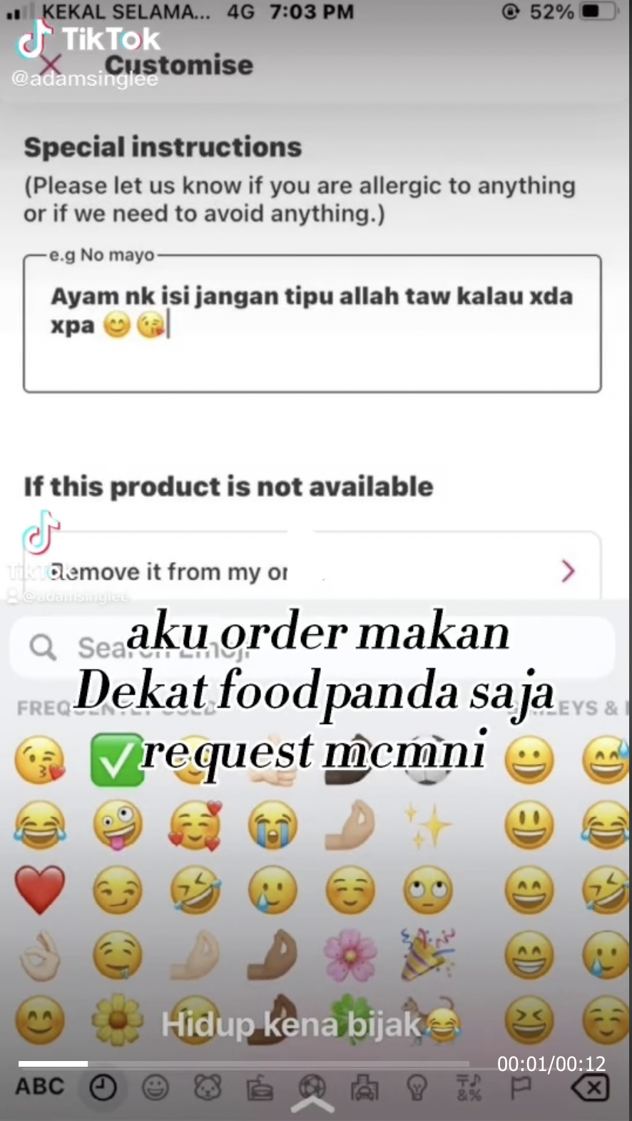 Sama seperti sebuah video di TikTok ini apabila seorang lelaki memesan makanan secara online dan meminta agar dberi bahagian isi ayam mencuri tumpuan ramai.