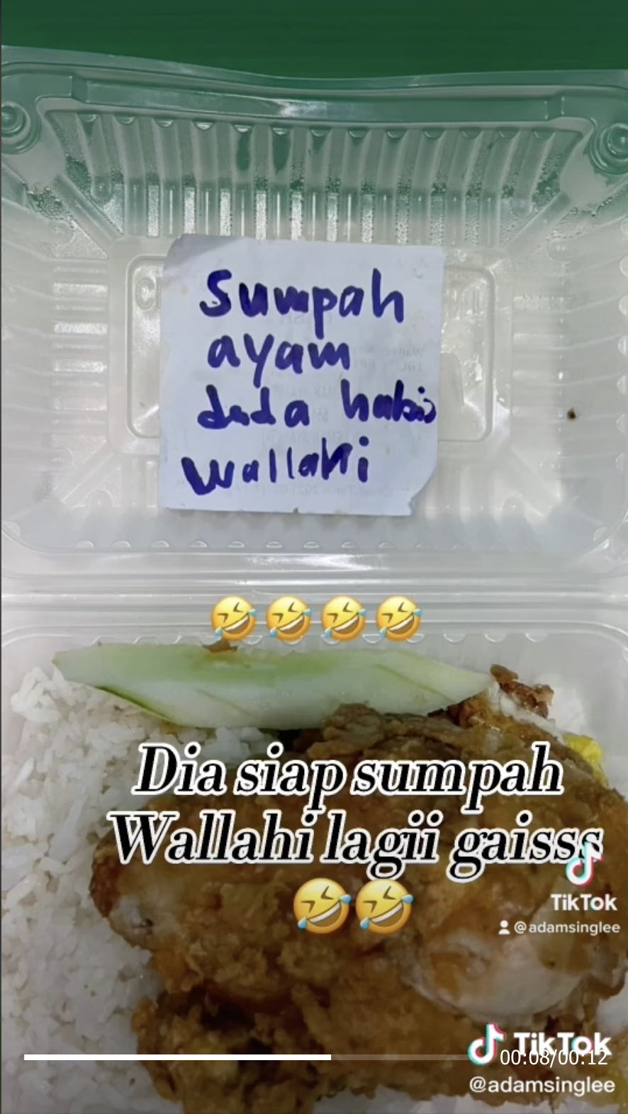 Namun, apa yang lebih menghiburkan adalah sebaik saja pesanan makanannya itu sampai dia menerima satu nota pada bungkusan makanannya oleh pihak kedai dengan menulis "Sumpah ayam dada habis Wallahi".