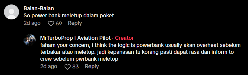 Juruterbang terbabit turut menjawab persoalan tentang risiko powerbank meletup jika diletak di dalam poket sendiri