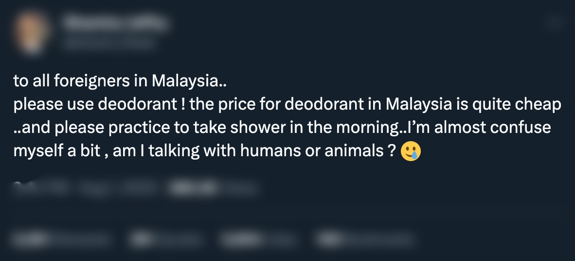"Kepada semua warga asing di Malaysia, sila gunakan deodoran! Harga untuk deodoran di Malaysia agak murah dan sila amalkan mandi pagi. Saya hampir keliru sedikit, adakah saya bercakap dengan manusia atau haiwan?," tulisnya.