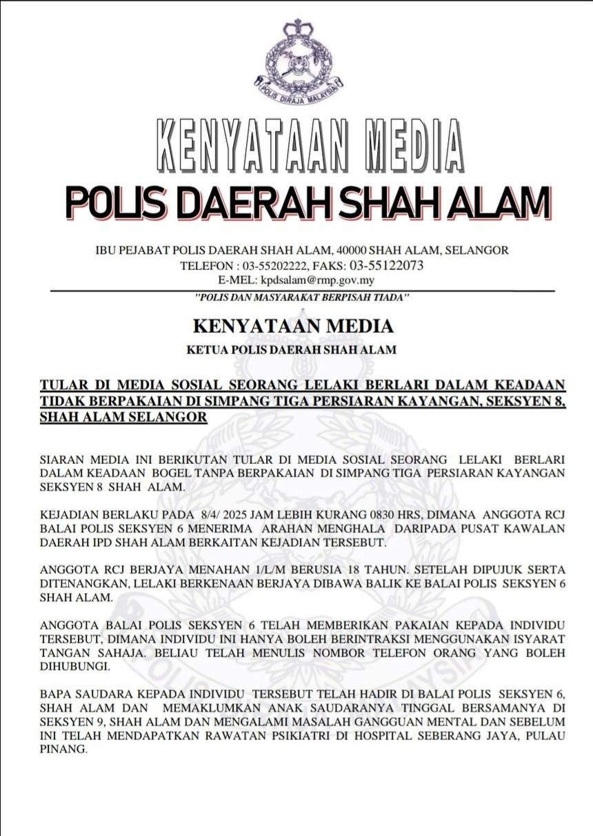 Polis Sahkan Lelaki ‘Jogging’ Dalam Keadaan Bogel Di Shah Alam Ada Masalah Gangguan Mental