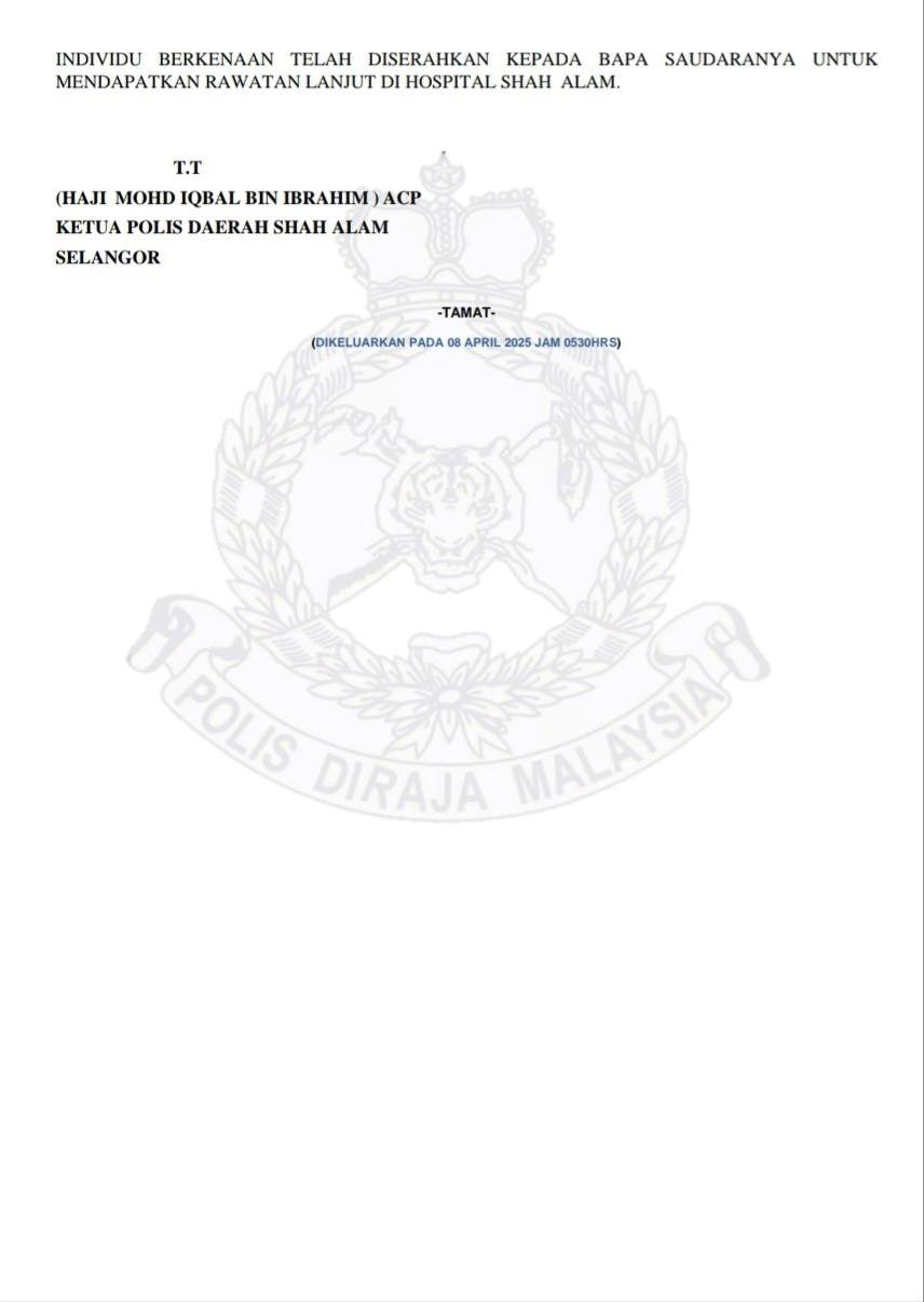 Menerusi kenyataan rasmi yang dimuat naik oleh pihak Polis (IPD) Shah Alam di Facebook, Ketua Polis Daerah Shah Alam, Asisten Komisioner Mohd. Iqbal Ibrahim berkata, setelah dipujuk dan ditenangkan remaja tersebut kemudiannya dibawa ke Balai Polis Seksyen 6 untuk tindakan lanjut.