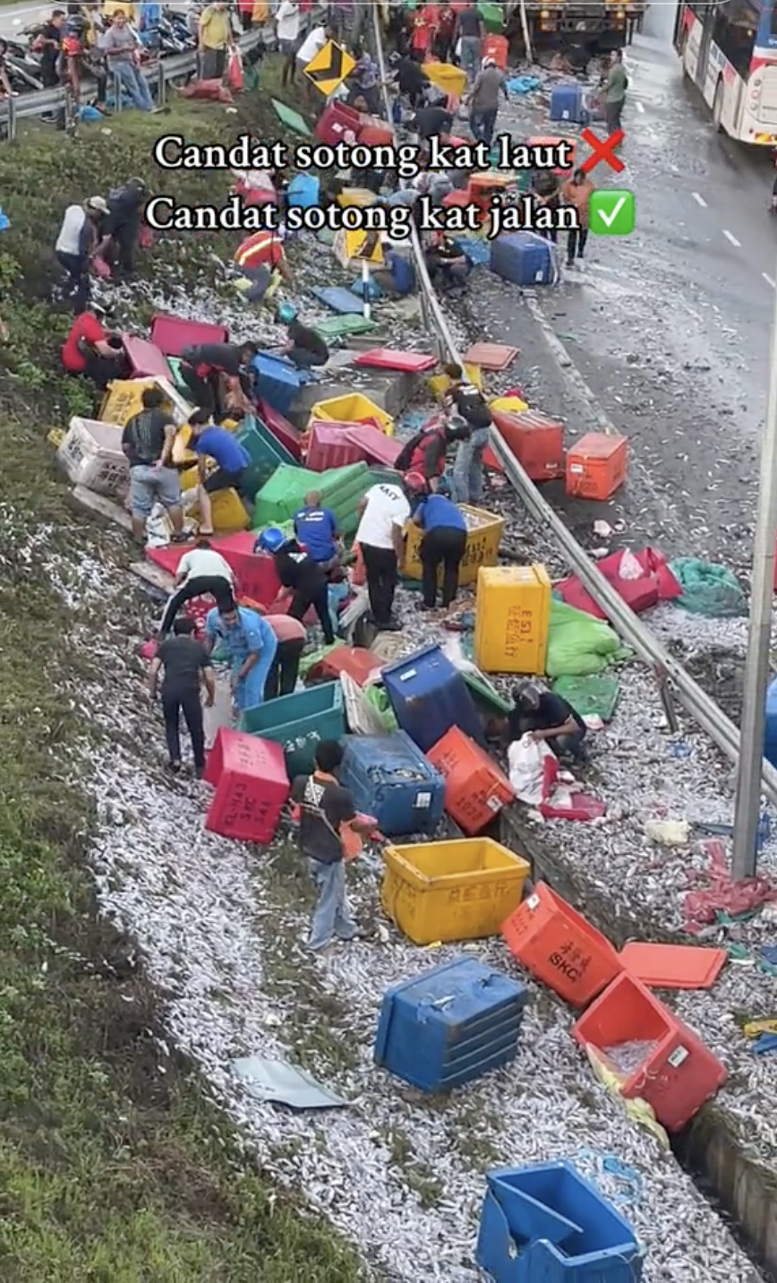 Dapat dilihat orang ramai mula berkumpul di tempat insiden lambakan sotong-sotong yang terjatuh daripada lori berkenaan dan mengambilnya.