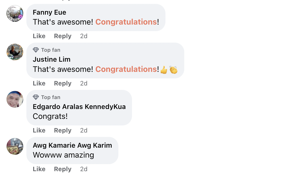 Dalam pada itu, tinjauan mendapati rata-rata netizen turut mengucapkan tahniah di atas kejayaannya itu.