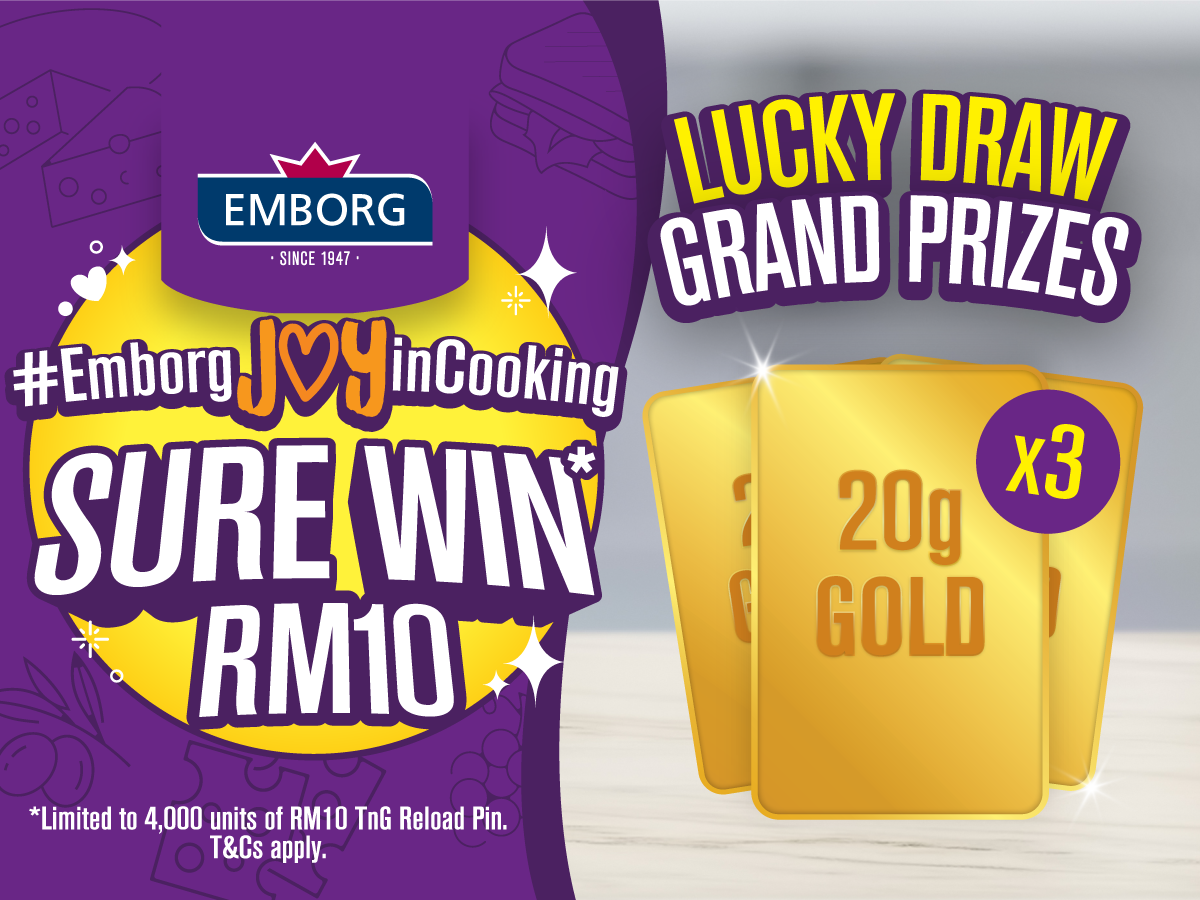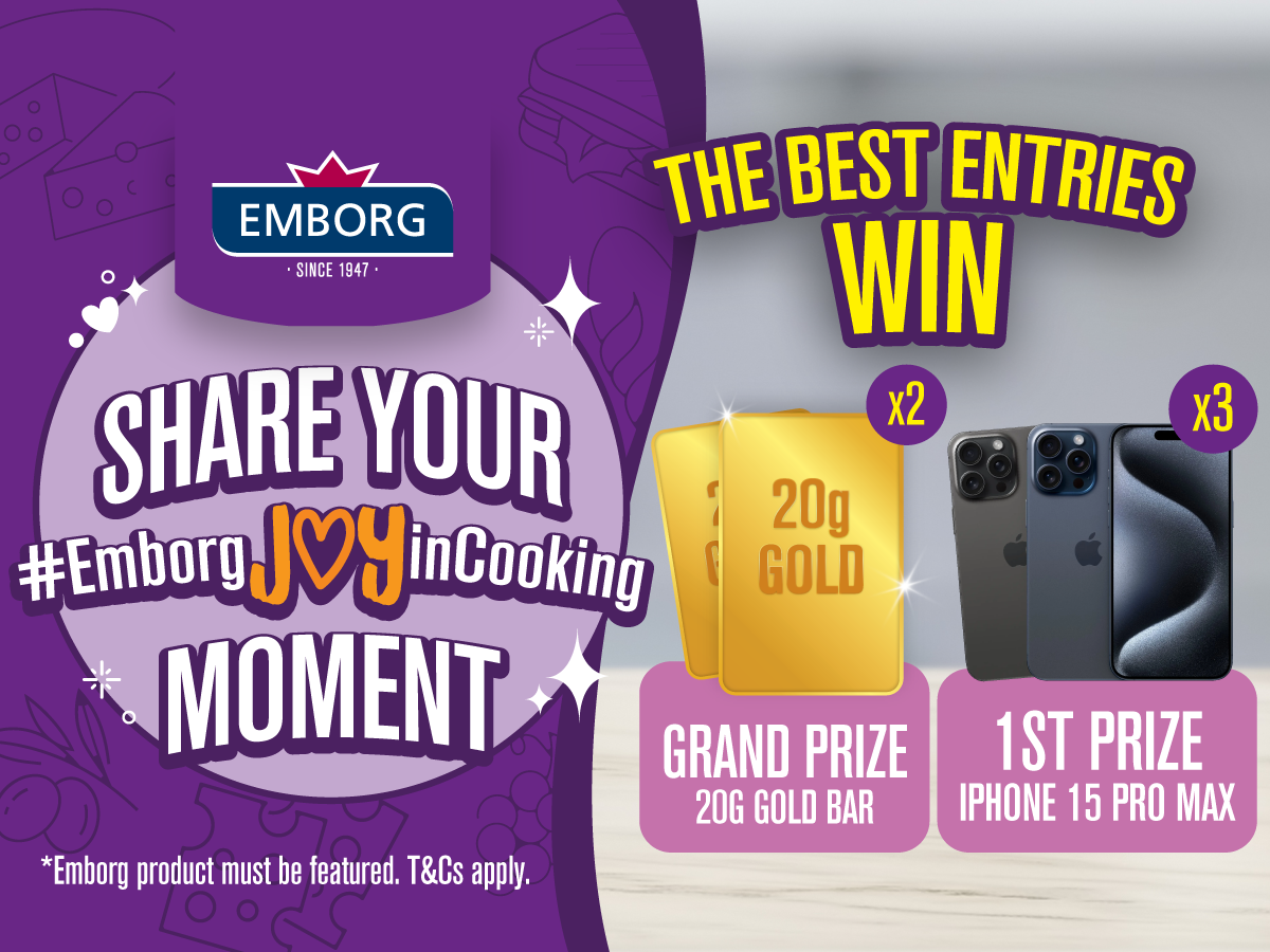 3. Bukan itu saja, sertai Peraduan Digital #EmborgFindJOYinCooking dan terdapat lebih banyak hadiah untuk dimenangi! Antaranya 3x iPhone 15 Pro Max bernilai RM6,499 dan 2x 20g gold Bar bernilai RM8,000!