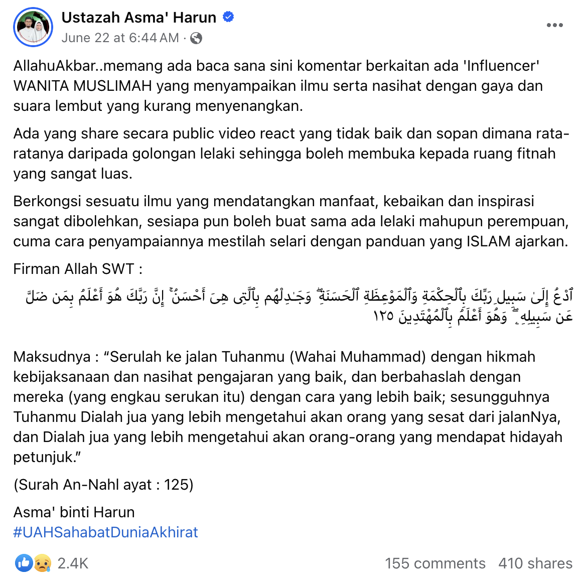 Malah, videonya itu turut mendapat perhatian pendakwah terkenal, Ustazah Asma yang menegur cara penyampaian pempengaruh itu.