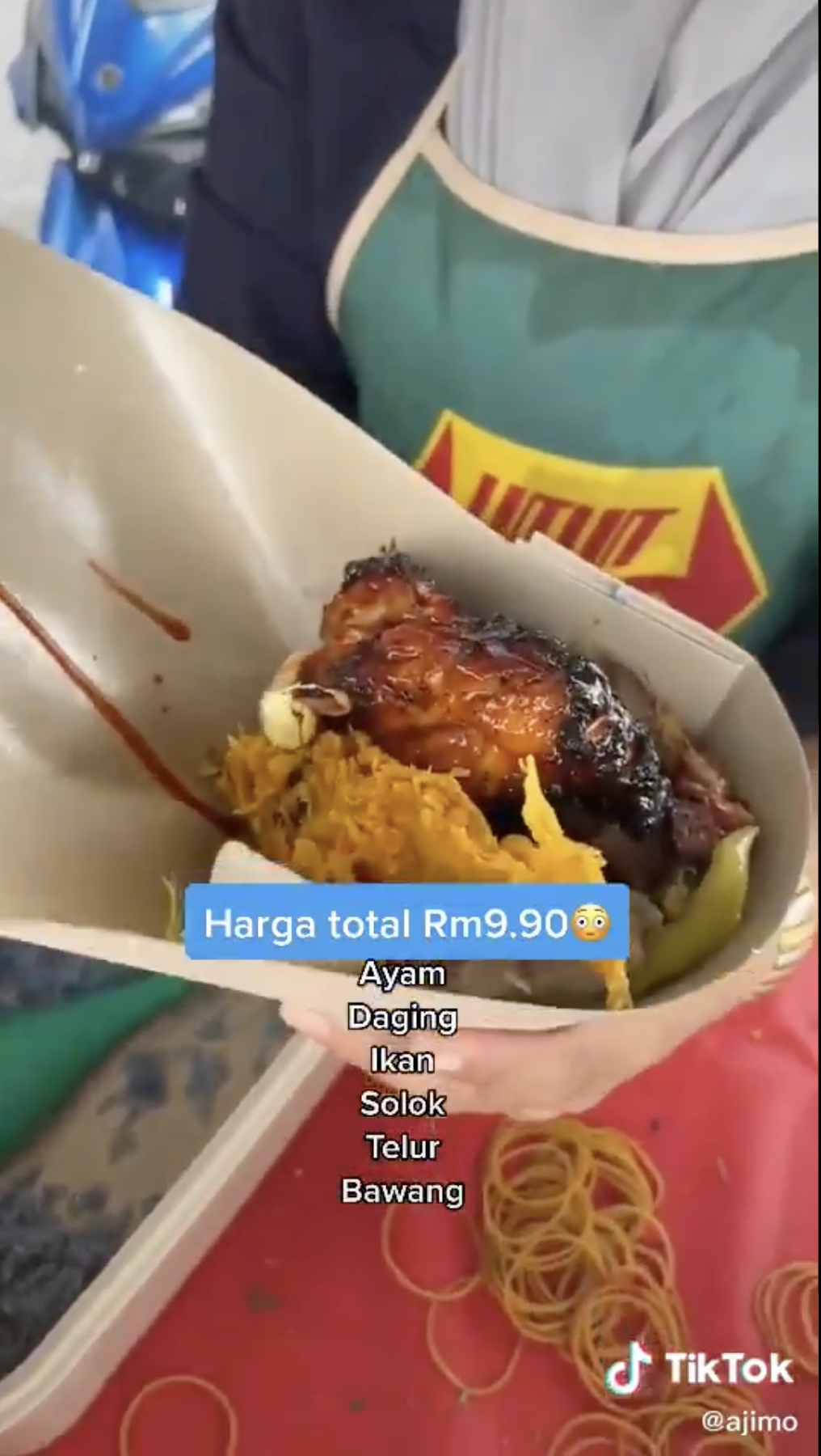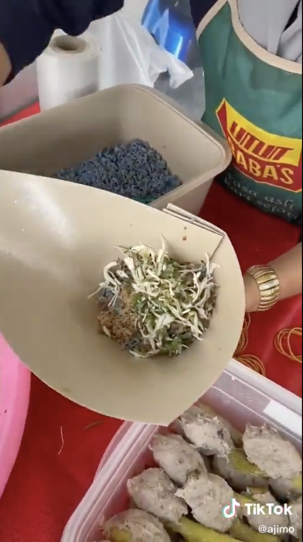 Dia kemudian membeli nasi kerabu dengan memilih enam jenis lauk berbeza buat dirinya. Antara lauk yang dipilihnya adalah ayam, daging, ikan, solok, telur dan bawang.
