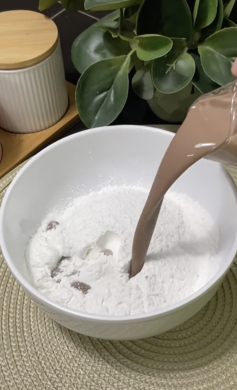 Pertama sekali, anda perlu menyediakan mangkuk dan masukkan tepung pulut, garam dan susu coklat.