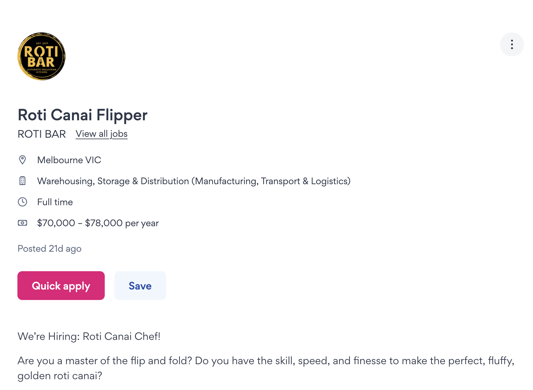 Jawatan sepenuh masa itu disiarkan oleh Roti Bar, sebuah restoran makanan Malaysia di Melbourne, menawarkan gaji AUD70,000 hingga AUD78,000 setahun iaitu bersamaan dengan kira-kira RM220,000 hingga RM245,000 setahun.