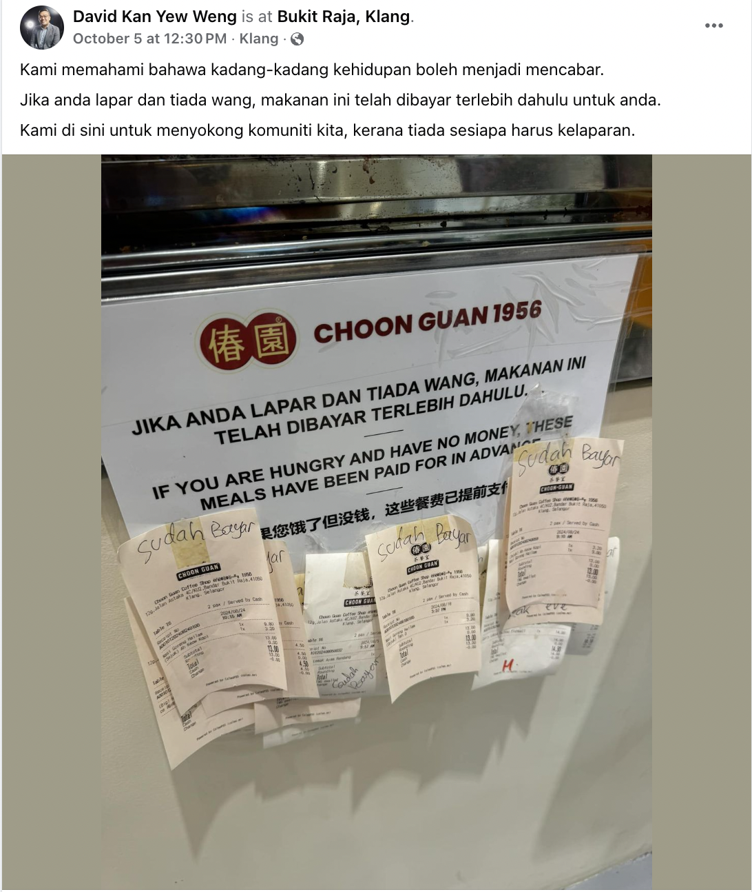 Menerusi posting tersebut, kelihatan sebuah restoran di Klang, Choon Guan Hainan Coffee 1956, menjadi tular selepas restoran itu membuat inisiatif dengan memberi makan kepada golongan yang kurang bernasib baik.