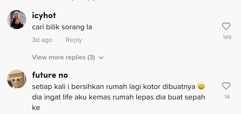 Namun, ada juga yang tidak suka dengan housemate mereka kerana mempunyai perangai yang kurang enak seperti pengotor dan sebagainya.