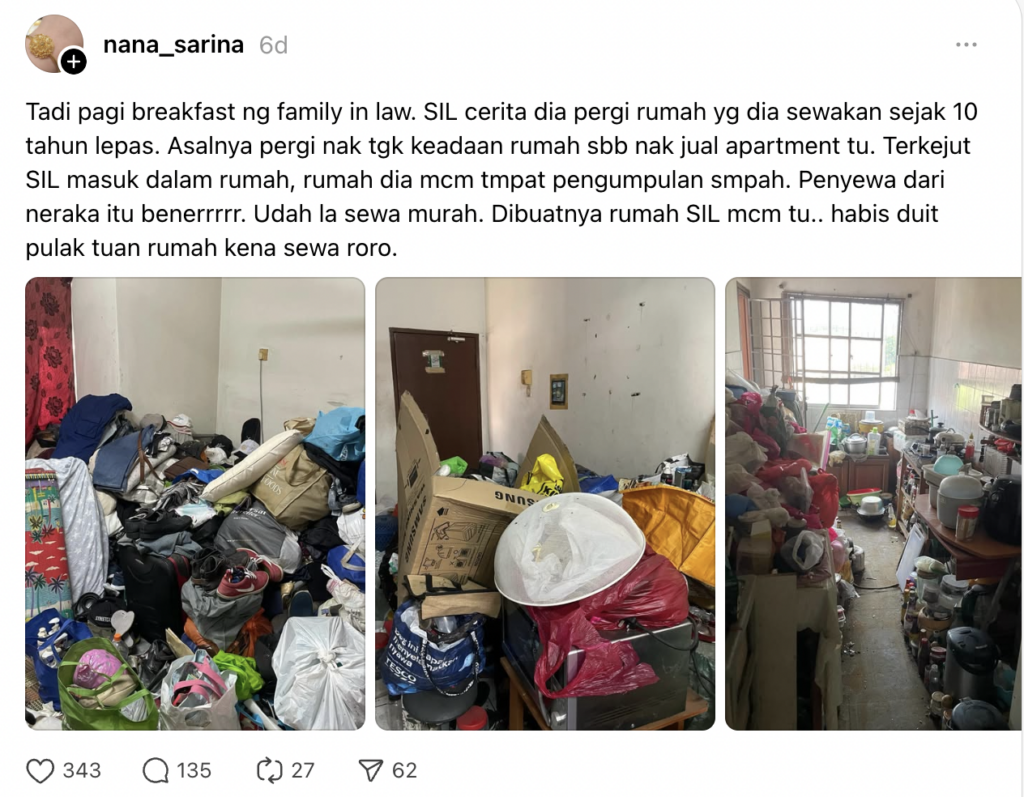"Terkejut SIL (Sister in law) masuk dalam rumah, rumah dia macam tempat pengumpulan sampah. Penyewa dari neraka itu benar. Udah la sewa murah. Dibuatnya rumah SIL macam tu, habis duit pula tuan rumah kena sewa roro," tulisnya.
