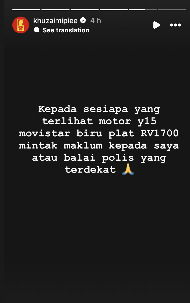 Menerusi hantaran gambar laporan polis yang beliau kongsikan di Instagram, Khuzaimi kehilangan sebuah motosikal, empat beg pelbagai jenama dan pasport.
