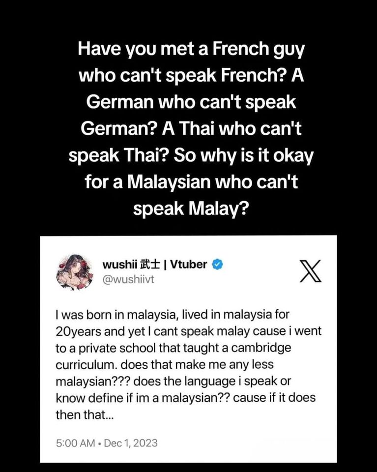 Adakah ini membuatkan saya 'kurang' Malaysia? Adakah bahasa yang saya tuturkan atau tahu mencerminkan sama ada saya seorang rakyat Malaysia?" tulisnya.