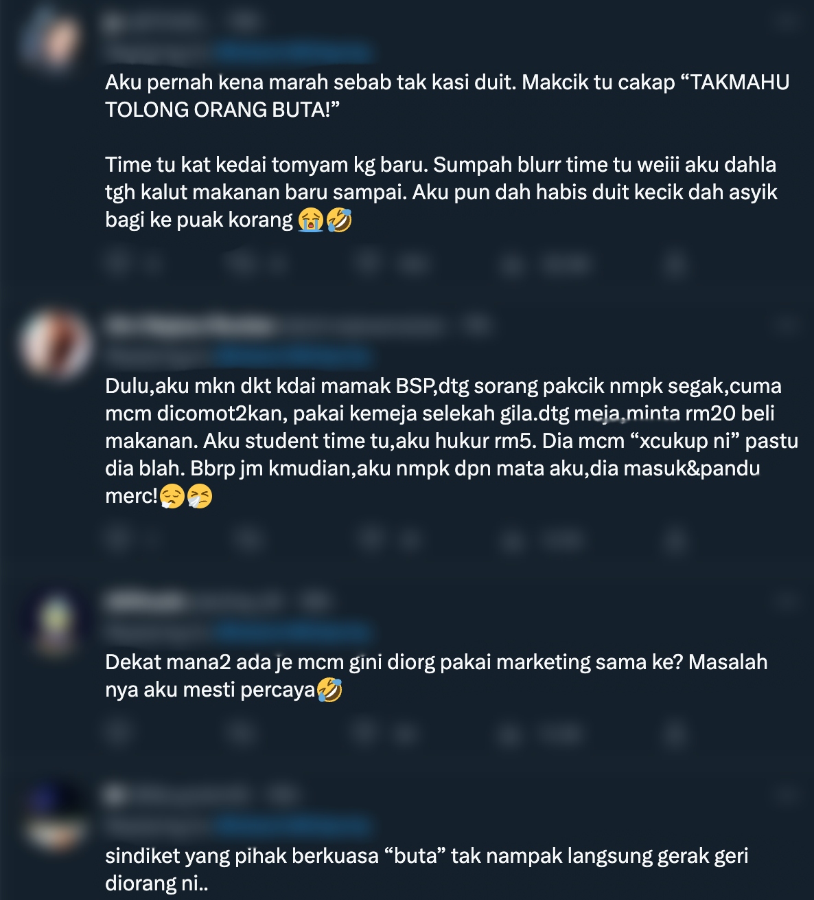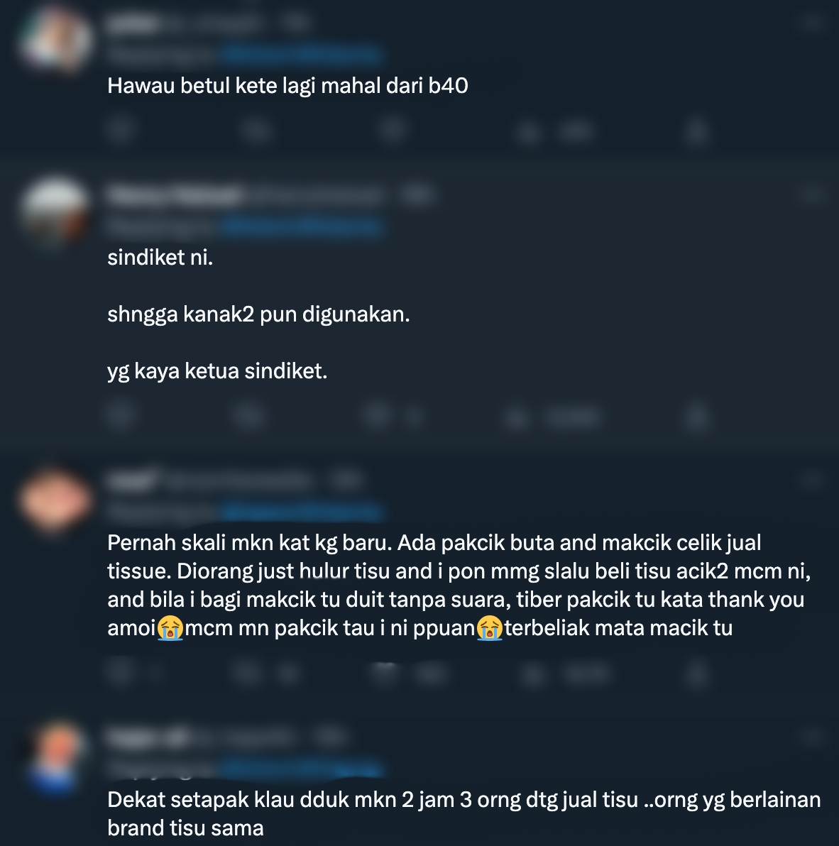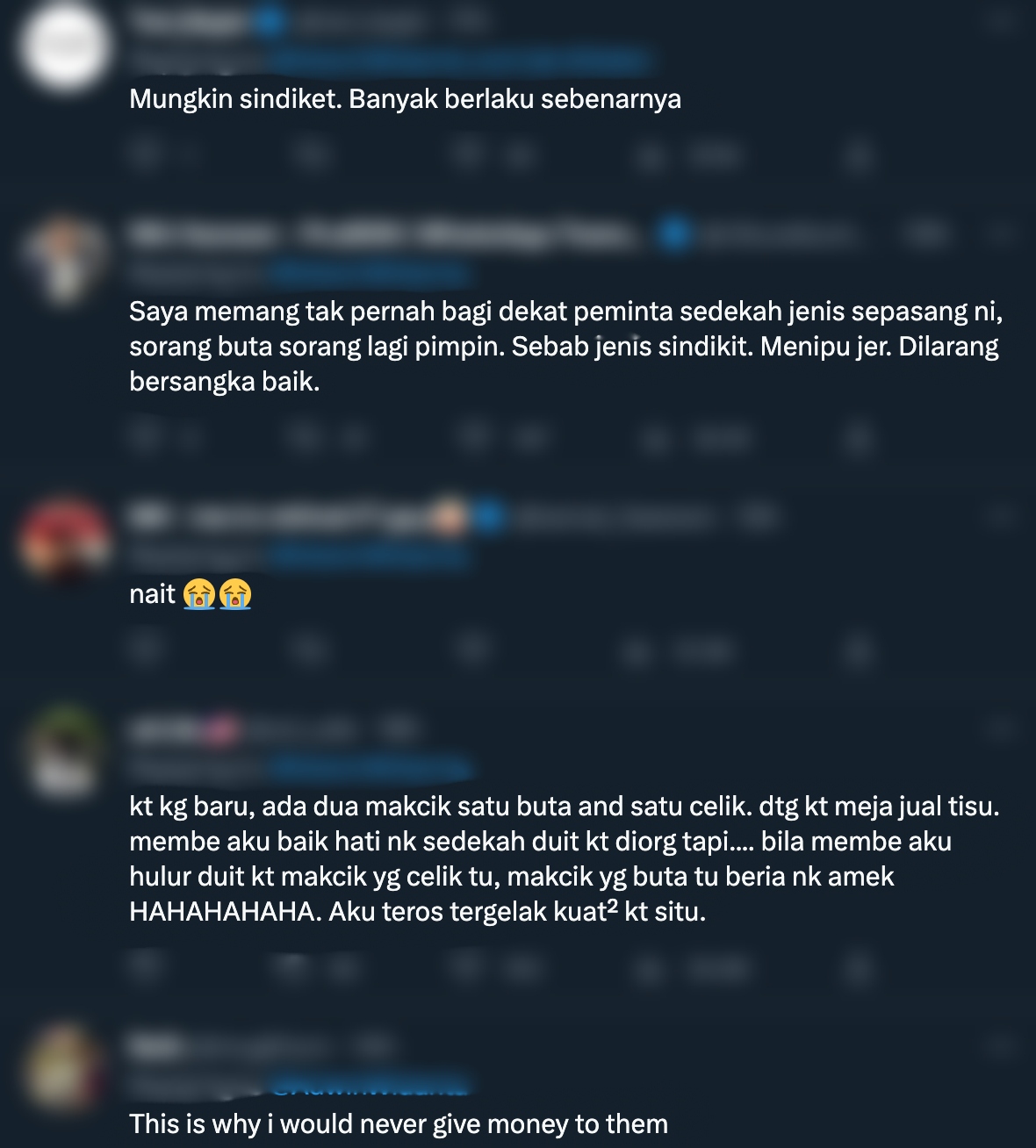 Malah, peminta sedekah ini juga kebanyakan daripada mereka bukanlah warganegara Malaysia pun. Banyak juga kes di sosial media individu berkongsi bahawa mereka kini lebih agresif dan mendapati bahawa ia adalah sindiket.