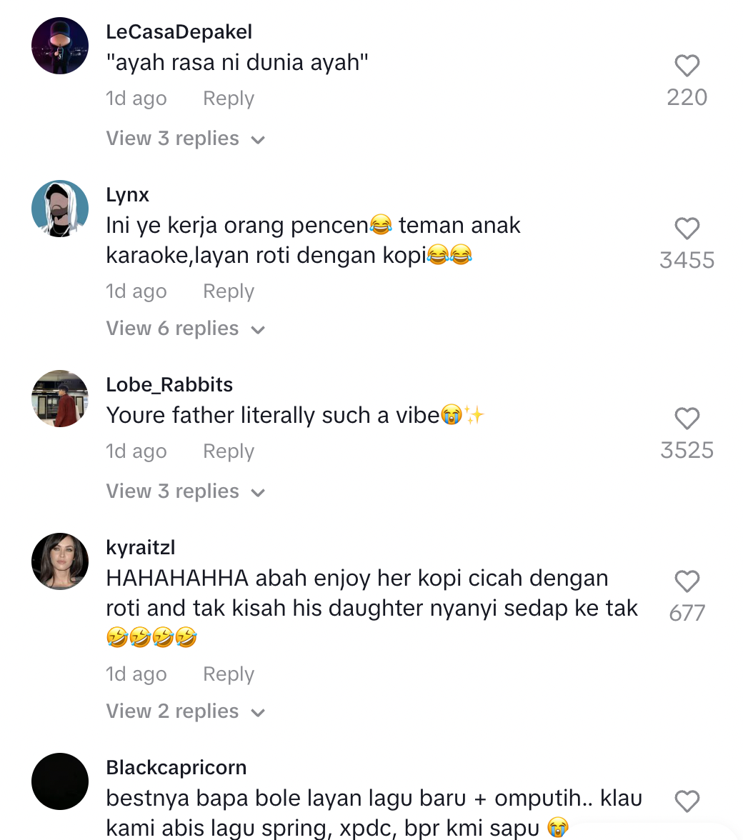 Namun, lain pula dengan video di TikTok ini apabila gadis berkongsi gelagat ayahnya yang selamba mencicah makanan di dalam pusat karaoke telah mencuit hati ramai.