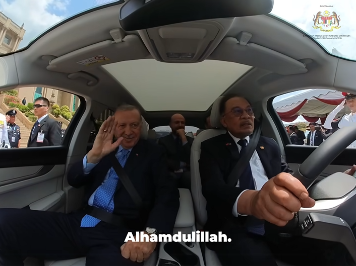 Menerusi video yang disiarkan di laman Facebook rasmi Anwar Ibrahim, Perdana Menteri dilihat santai membawa Erdogan 'jalan-jalan' menaiki SUV EV Togg T10X.