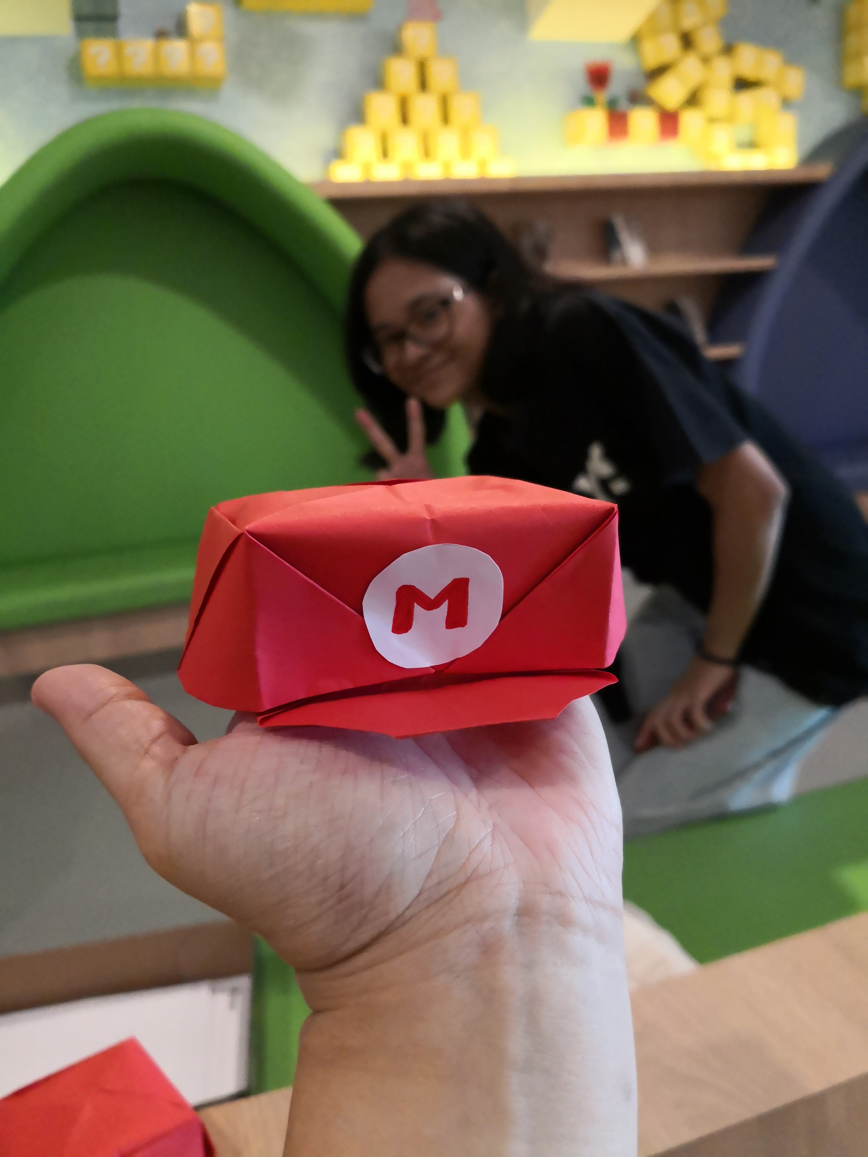 Di stesen Seni & Kraf SAYS, kanak-kanak digalakkan untuk menonjolkan kreativiti mereka dengan membuat topi origami 'Mario' dan 'Luigi', sambil menikmati helaian pewarna