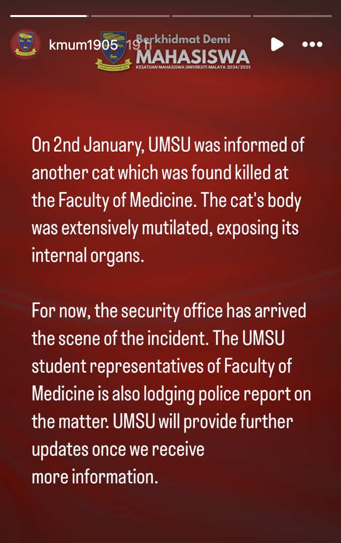 Dalam satu kenyataan di Instagram Story, Kesatuan Mahasiswa Universiti Malaya (KMUM) berkata, pihaknya dimaklumkan mengenai penemuan kucing mati di Fakulti Perubatan pada Khamis, 2 Januari.