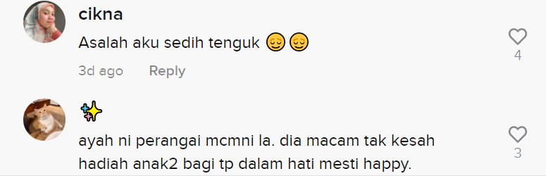 Apa yang lebih menarik tumpuan adalah sebaik saja si ayah membuka kotak hadiah itu, mukanya terus berubah seolah-olah gembira dan bersyukur dengan hadiah berkenaan.