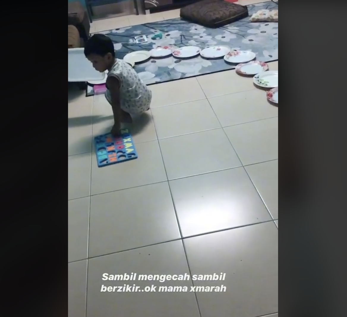 Menerusi video yang dimuat naik oleh @naddy7392, kelihatan dia sedang merakam anaknya itu membuat sepah di ruang tamu rumah mereka.