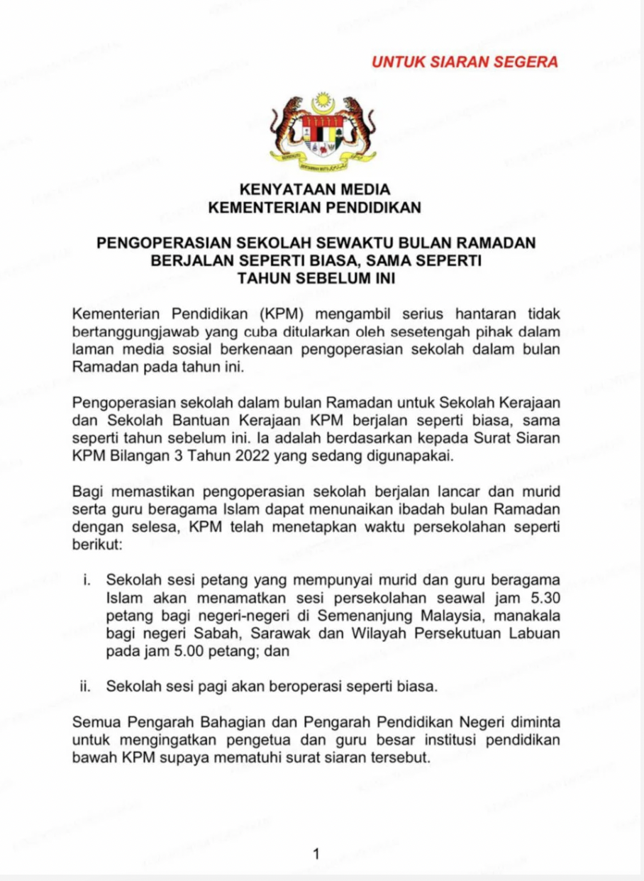 Dalam pada itu, kenyataan tersebut turut memaklumkan pengoperasian sekolah sepanjang Ramadan bagi sekolah kerajaan dan sekolah bantuan kerajaan di bawah Kementerian Pendidikan (KPM) berjalan seperti biasa, sama seperti tahun sebelumnya.