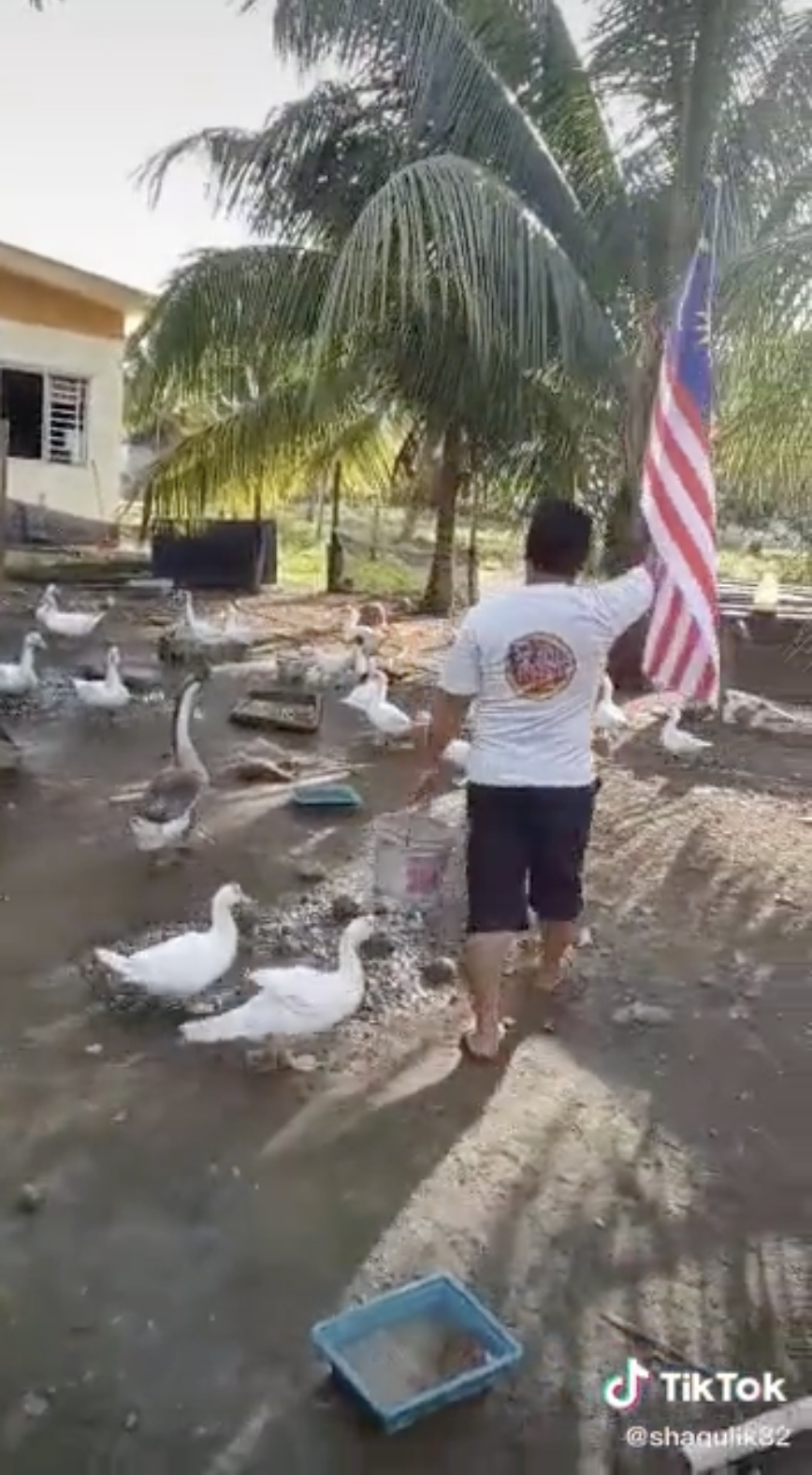 Menerusi video tersebut, kelihatan seorang lelaki sedang berada di kawasan kandang angsa peliharaannya untuk memberi makan.