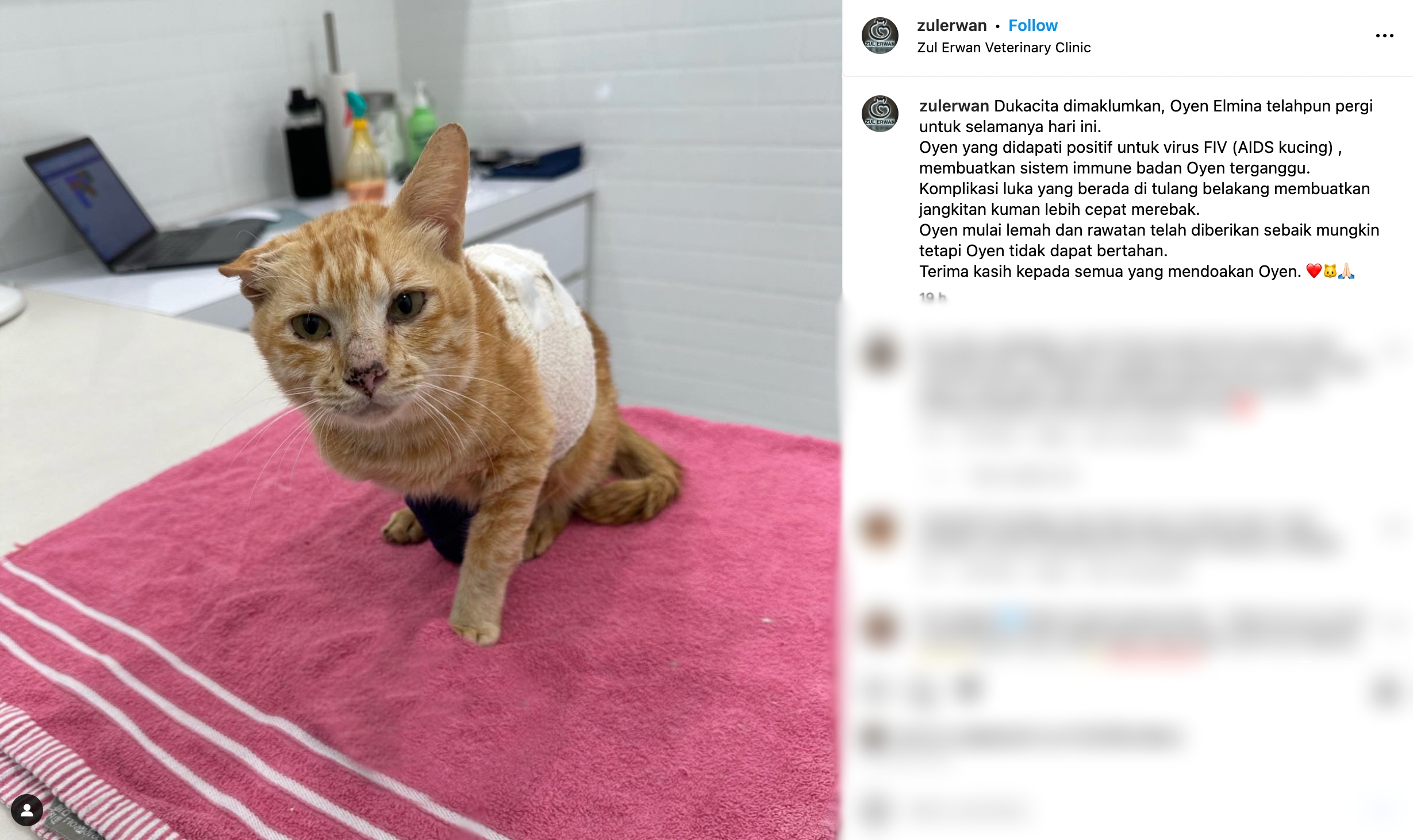 "Dukacita dimaklumkan, Oyen Elmina telahpun pergi untuk selamanya hari ini. Oyen yang didapati positif untuk virus FIV (AIDS kucing) , membuatkan sistem immune badan Oyen terganggu"