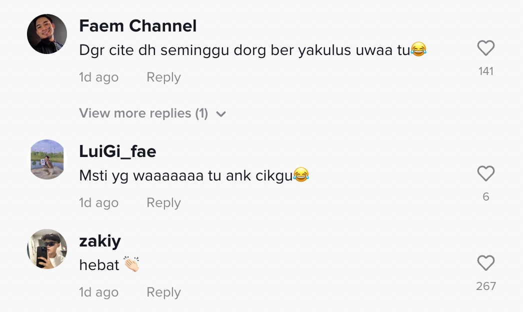 Sementara itu, tinjauan di ruangan komen mendapati rata-rata netizen turut terhibur dan memberikan pelbagai reaksi masing-masing.
