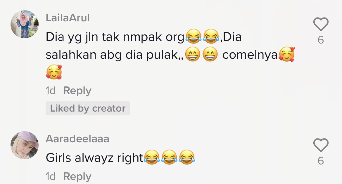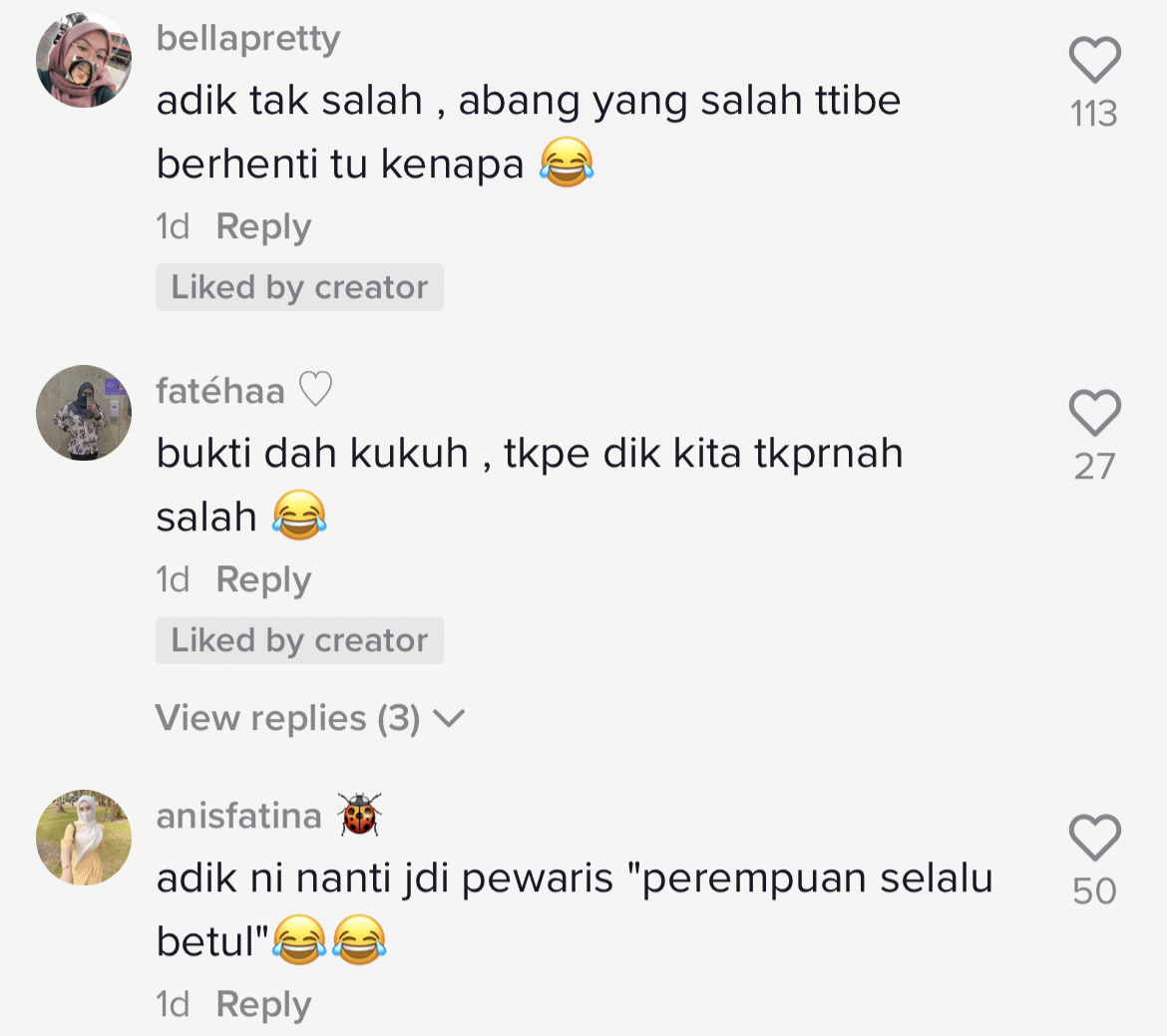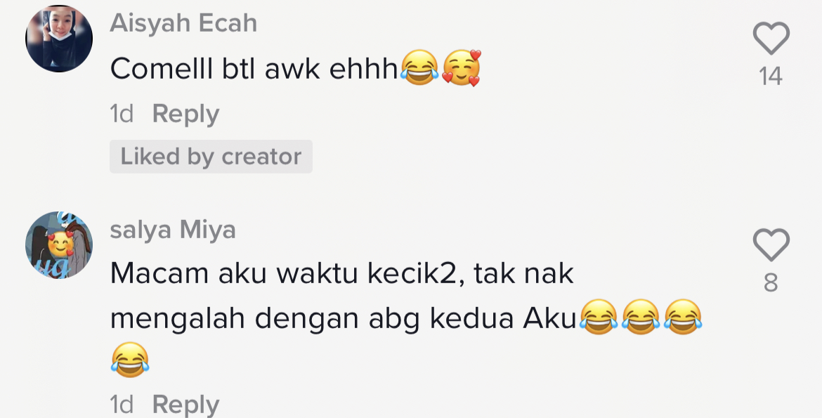Susulan tularnya video berkenaan yang kini telah meraih 884.3K views, 54.6K likes dan 1.9K shares di TikTok, rata-rata netizen turut terhibur dengan gelagat budak perempuan itu memarahi abangnya walaupun terjatuh sendiri.