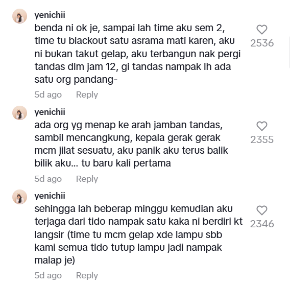 Menurutnya, perkara misteri itu mula dialaminya setelah masuknya semester kedua di mana dia menjumpai lembaga yang dipercayai penanggal di dalam tandas.