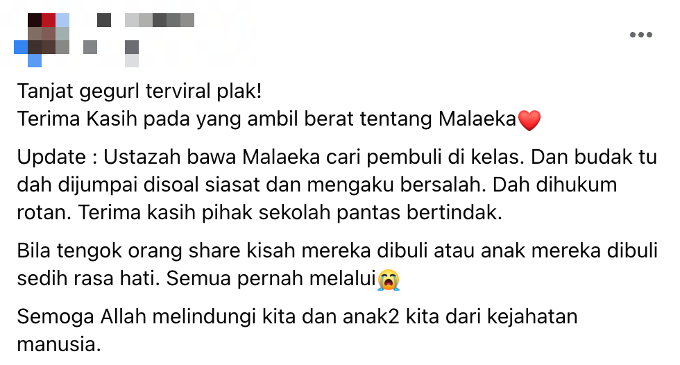 Menerusi posting tersebut, wanita itu meluahkan rasa sedihnya apabila mendapat tahu anaknya dibuli.