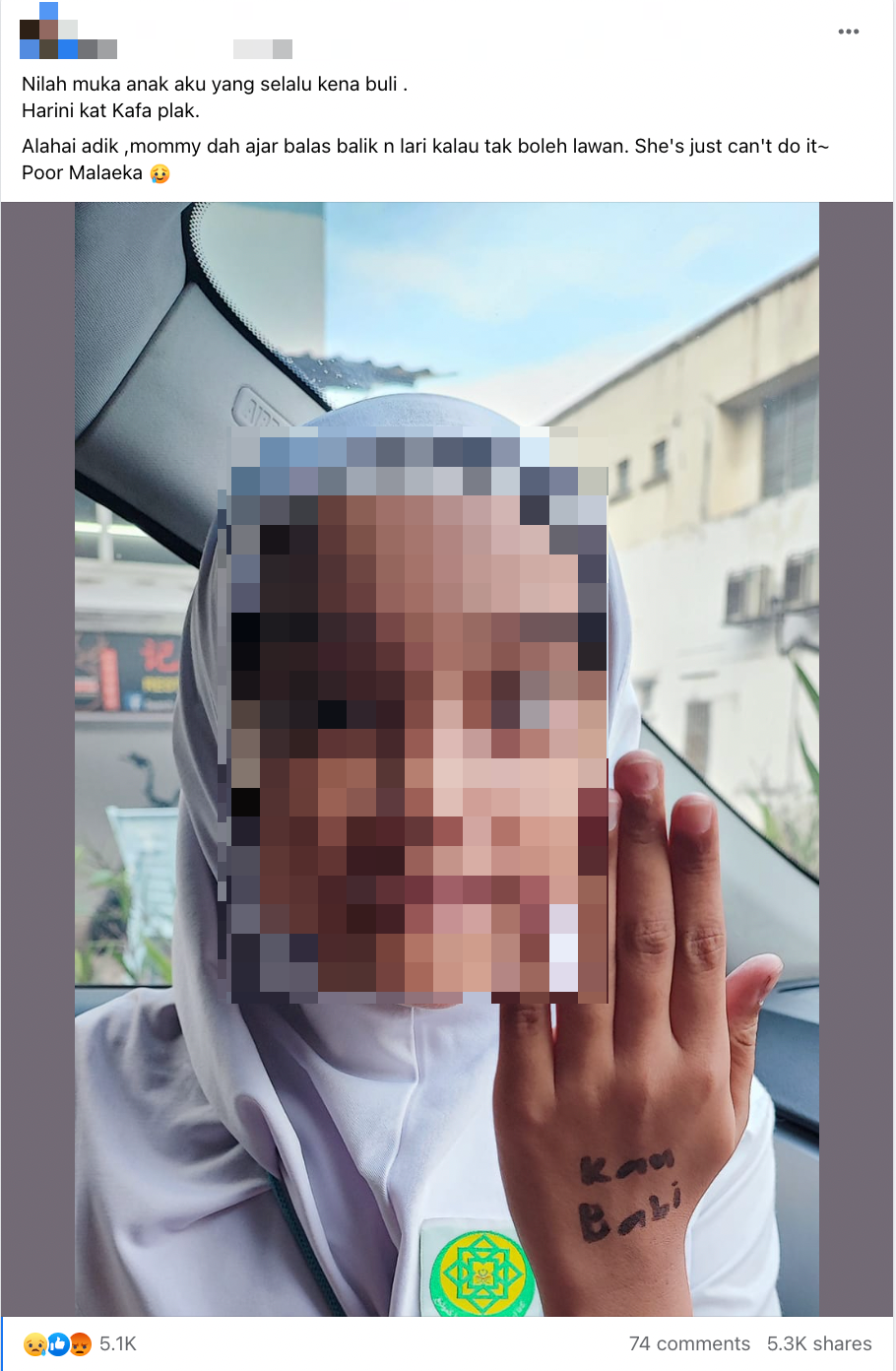 Difahamkan, anak perempuannya itu dibuli semasa dia berada di Kelas Al-Quran dan Fardu Ain (KAFA). Dapat dilihat tangan anaknya diconteng dengan perkataan "kau babi".