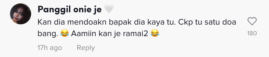 "Kan dia mendoakan bapa dia kaya tu. Cakap tu satu doa bang. Amin kan je ramai-ramai" – Netizen