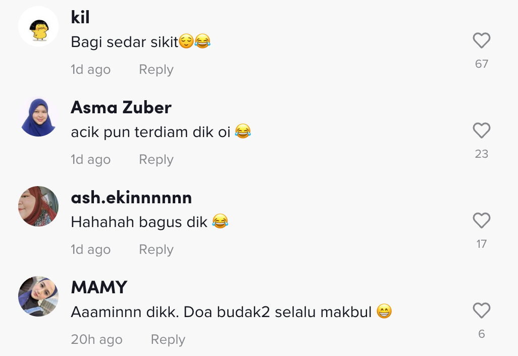 Dalam pada itu, tinjauan di ruangan komen mendapati rata-rata netizen turut terhibur mendengar ayat anaknya itu.