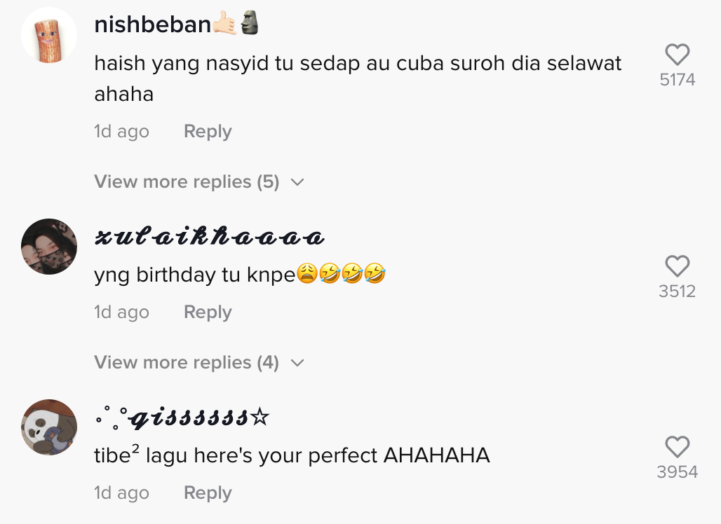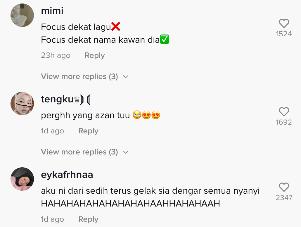 Sementara itu, tinjauan di ruangan komen mendapati rata-rata netizen turut merasa terhibur melihat video tersebut. Malah, ramai yang memberikan reaksi mereka masing-masing mengenai suara rakan-rakannya itu.