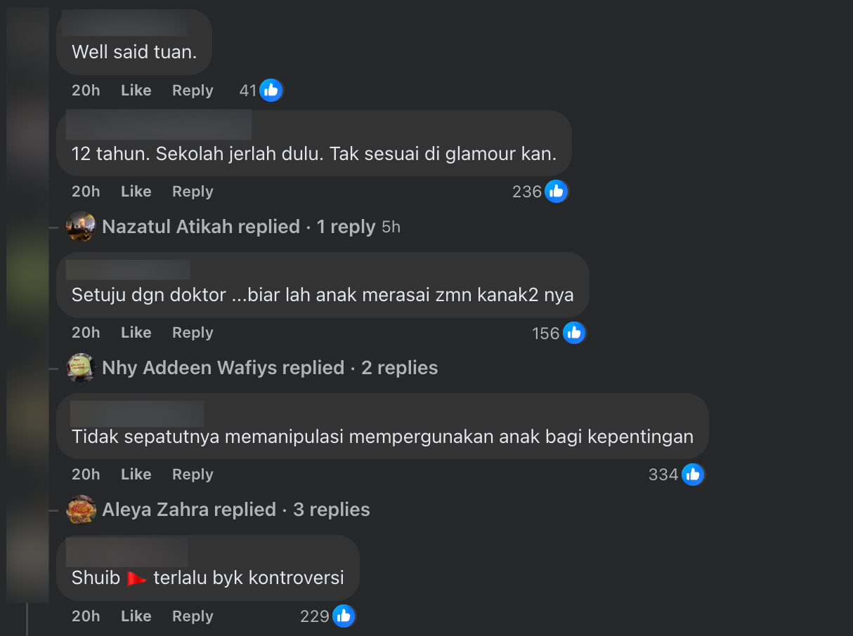 "Seorang anak berumur baru 12 tahun belum mempunyai 'penapis' untuk memproses komen-komen negatif apatah lagi 'mampu tahan' dengannya. Dalam konteks ini dia adalah mangsa yang belum bersedia nak hadap realiti dunia. Kena faham keluhan dan tangisannya itu adalah BUKTI dia TIDAK bersedia," tulisnya.