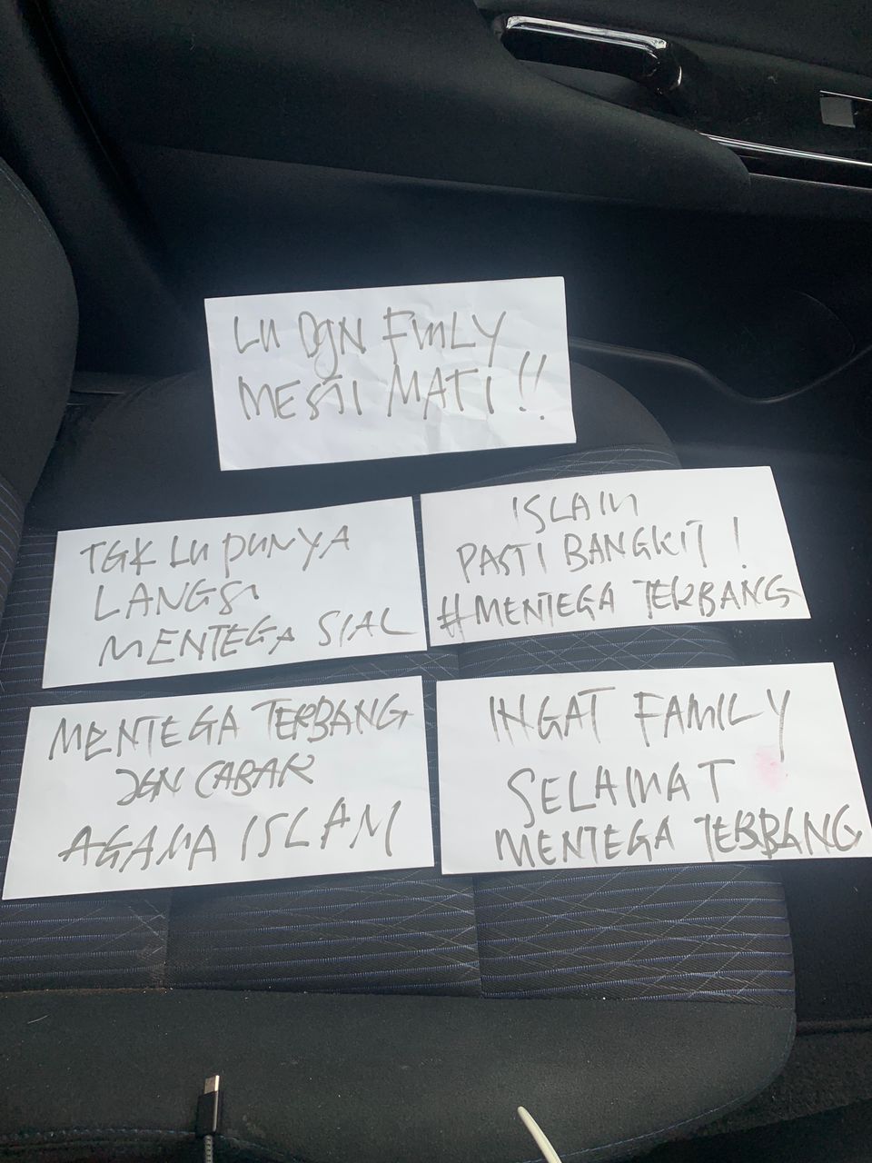 Nota bertulis 'Lu dengan family mesti mati' dan disertakan nota amaran 'Mentega Terbang jangan cabar agama Islam' itu telah ditinggalkan di dalam kereta.
