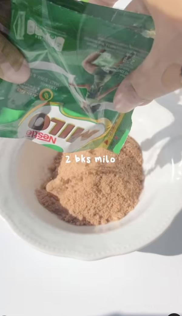 1. Masukkan 2 packet serbuk Milo ke dalam mangkuk yang sederhana besar.