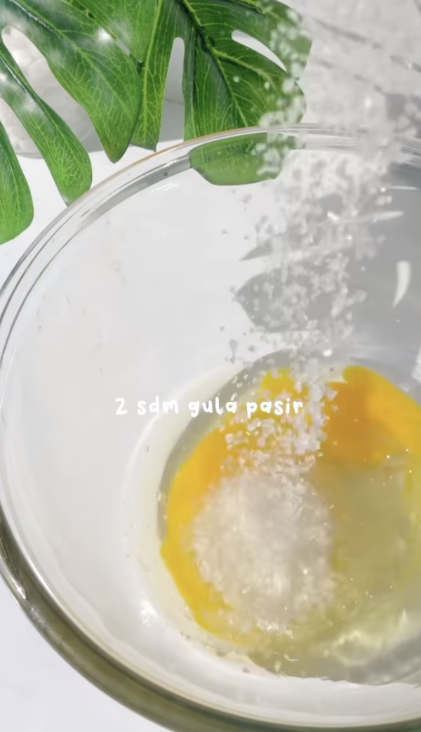 3. Di dalam mangkuk yang lain, pecahkan sebiji telur kemudian masukkan gula dan kacau. Selepas itu, masukkan pula tepung dan kacau lagi hingga sebati.