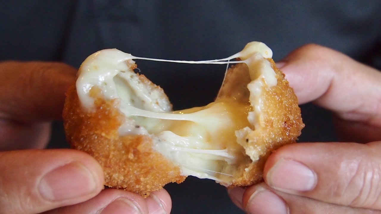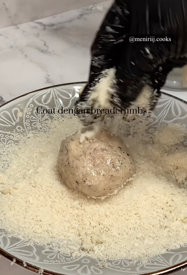 7. Selepas itu, salutkan isi ayam bersama mozzarella cheese tadi bersama dengan serbuk roti. Kemudian, goreng di dalam minyak yang panas sehingga ia kekuningan.