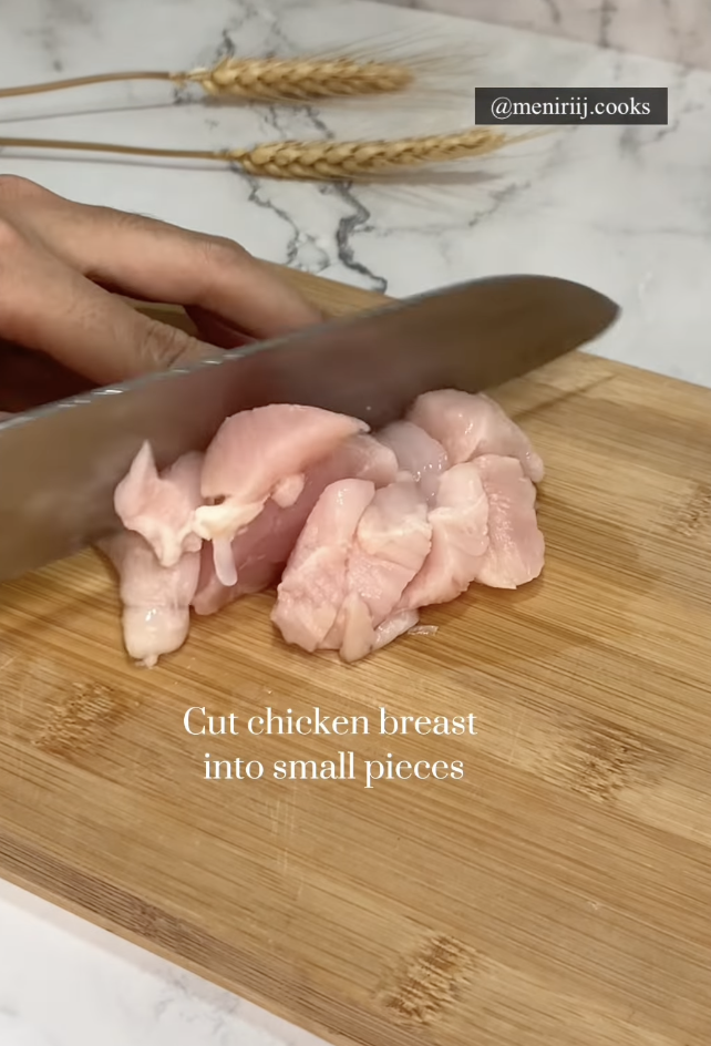1. Potong isi dada ayam ke bahagian yang kecil.