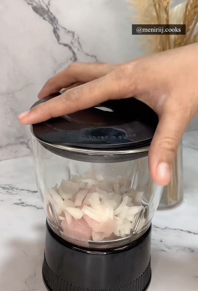 2. Kemudian, masukkan isi ayam ke dalam blender dan kisarkan bersama bawang holland sehingga ia menjadi halus.