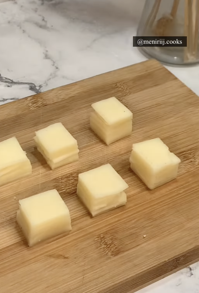 5. Potong mozzarella cheese dalam bentuk segi empat yang kecil.
