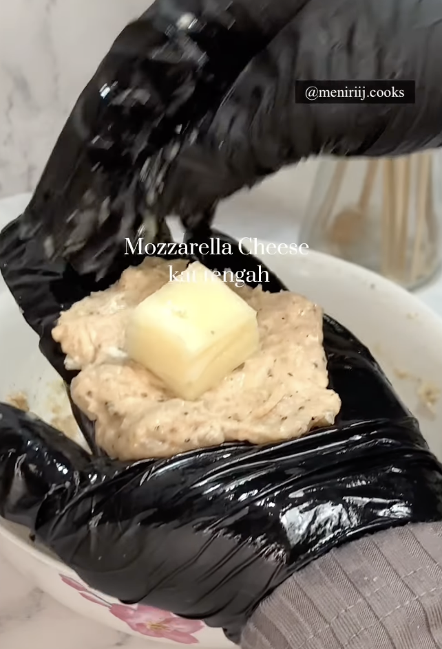 6. Salutkan isi ayam bersama mozzarella cheese yang dipotong segi empat tadi. Jangan lupa letak sedikit minyak di atas tapak tangan anda supaya ia tidak melekat.