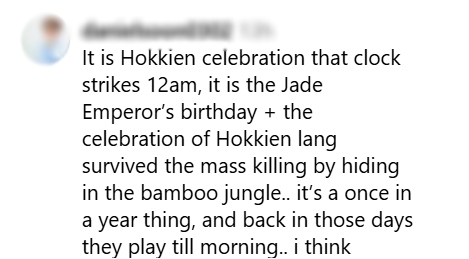 Komen tersebut memberitahu tepat sahaja jam 12, masyarakat Hokkien akan menyambut perayaan itu sempena hari lahir Jade Emperor mengikut kepercayaan masyarakat Hokkien.